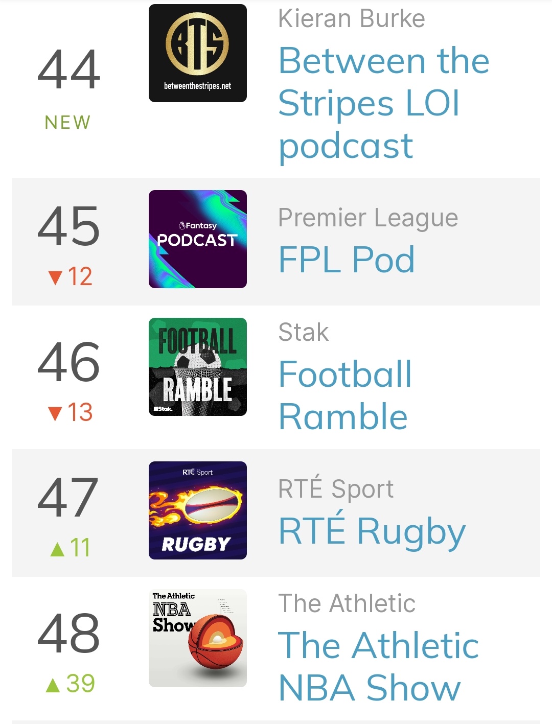 Between The Stripes On Twitter Once Again This Week We Are Brimming With Pride To See Our Podcast Inside The Top 20 Football Podcasts In Ireland And Inside The Top 100 Sports